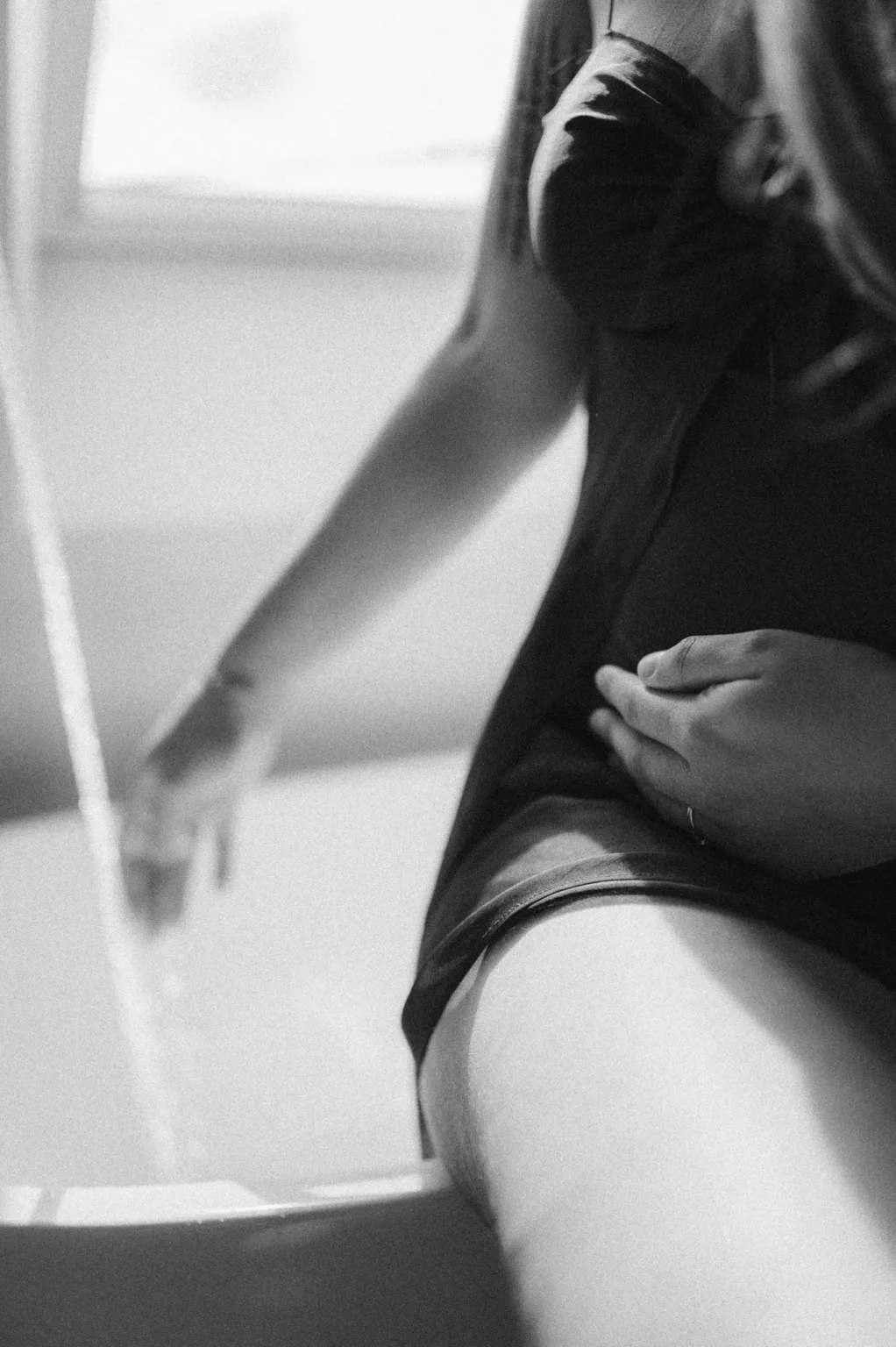Pendant que l’eau chaude coule, je prends quelques portraits d’Eugénie au bord de la fenêtre. C’est encore tôt le matin et la lumière lui caresse somptueusement le visage. Elle est magnifique. Puis elle se met à l’eau. De la musique douce nous accompagne dans notre moment. À moitié nue, je découvre son ventre d’à peine quatre mois. La nature est merveilleuse et la scène, splendide. Eugénie est elle-même photographe et sait ce qu’elle souhaite. Entre ses propositions et les miennes le temps passe à la vitesse d’une fusée. Il est déjà temps pour moi de reprendre mon train. Une accolade en guise d’au revoir, je n’oublierai jamais cette parenthèse de poésie qu’elle m’a offerte.